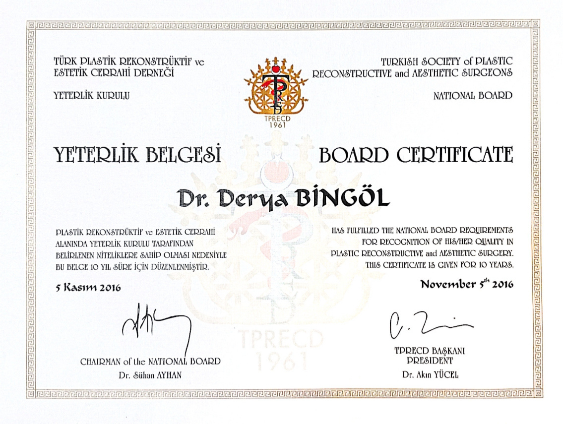 She got the European Board of Plastic Reconstructive and Aesthetic Surgery Certification and Turkish Board of Plastic Reconstructive and Aesthetic Surgery Certification in 2016.